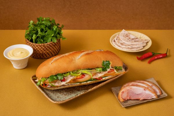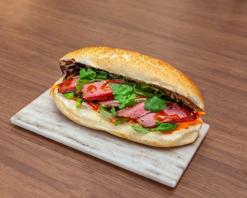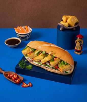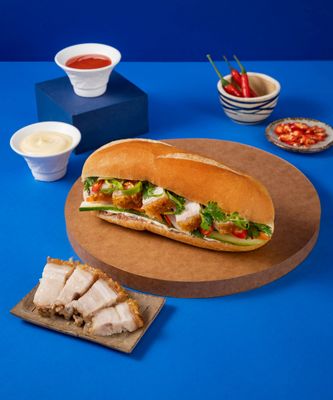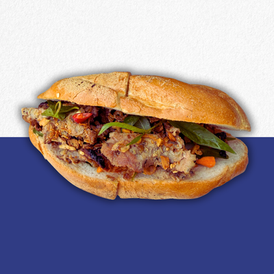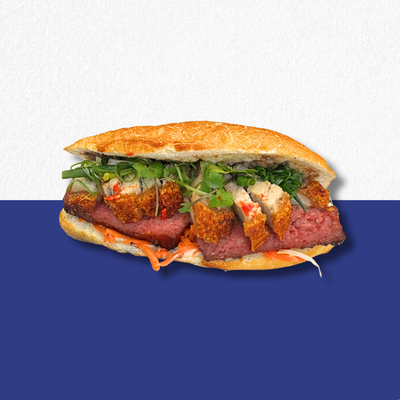 Our best-selling banh mi, packed with the perfect mix of Crispy Pork and Honey Pork, layered with butter, pate, pickled carrot & daikon, cucumber, spring onion, coriander, plum sauce, and a kick of fresh chilli (optional).