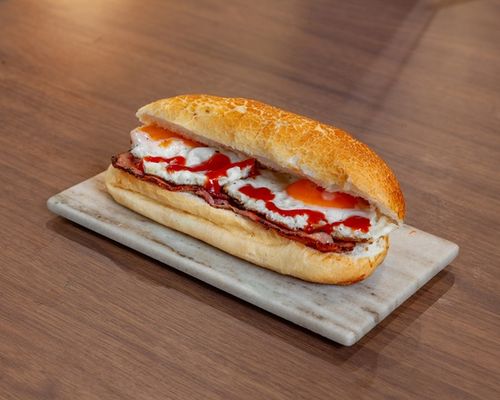 Perfect breakfast with freshly cooked omlette and bacon served in bread with choices of sauces and cheese (optional)