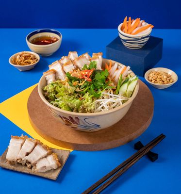 Crispy Roast Pork served with shredded lettuce, daikon and carrot pickle, cucumber, mixed herb, fried shallot, peanut and sweet and sour fish sauce.