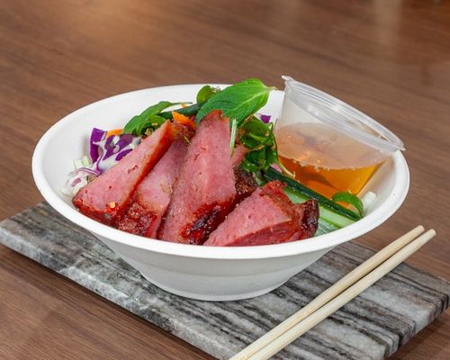 Honey Pork served with shredded lettuce, daikon and carrot pickle, cucumber, mixed herb, fried shallot, peanut, sweet and sour fish sauce.