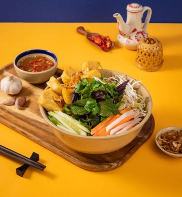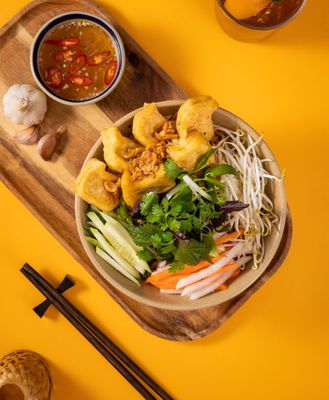 Tasty Tofu served with shredded lettuce, daikon and carrot pickle, cucumber, mixed herb, fried shallot and peanut, and sweet and sour vegan fish sauce.