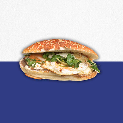 Traditional Vietnamese breakfast roll served with pate, egg butter, fried egg and fresh herbs.