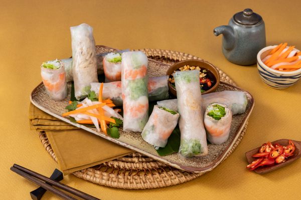 1 Prawn rice paper roll served with peanut hoisin sauce.