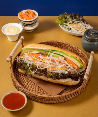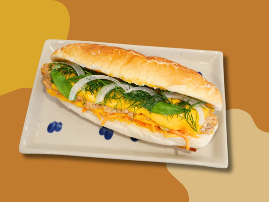 A blend of house-mixed tuna and spicy mayonnaise, pickled carrots, fresh red onion, Vietnamese mint, dill, fried shallots, and melted American cheese. (Fresh chili optional).
