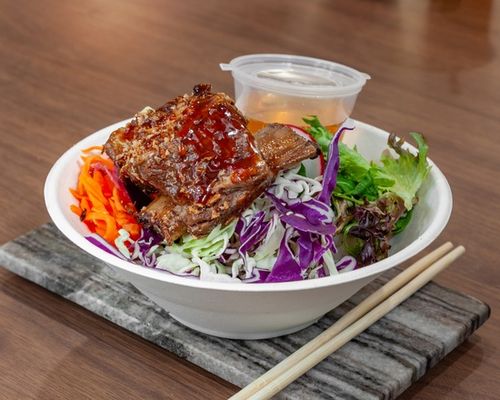 Twice-cooked brisket beef on rice served with cabbage pickle, mixed salad, cucumber, herbs, chilli and sesame chilli sauce (mild spicy sauce).