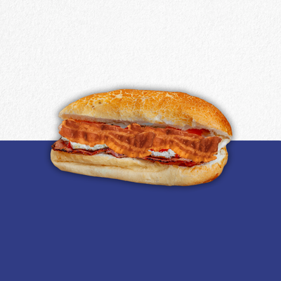 Perfect breakfast with freshly cooked bacon served in bread with choices of sauces and cheese (optional)