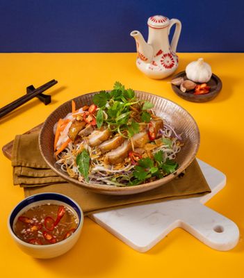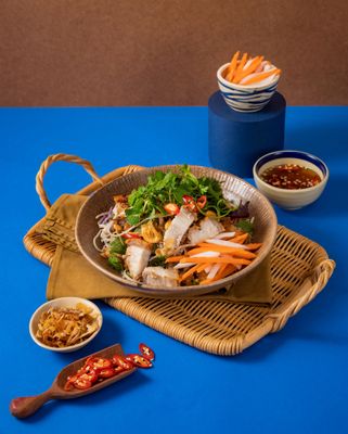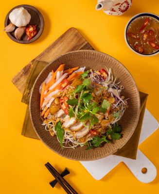 Roast lemongrass chicken served with shredded lettuce, daikon and carrot pickle, cucumber, mixed herb, fried shallot, peanut, and sweet & sour fish sauce.